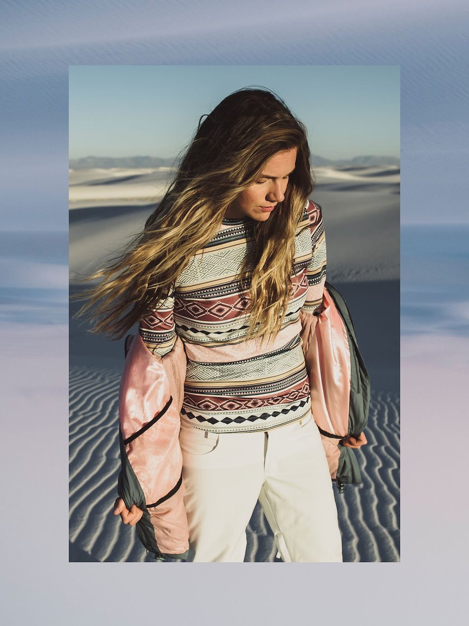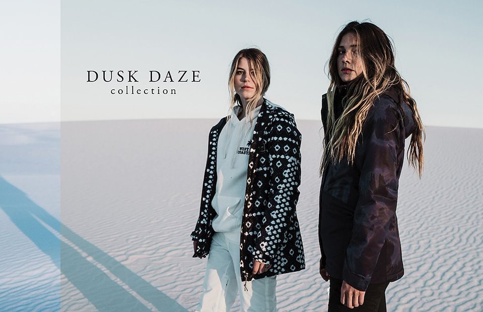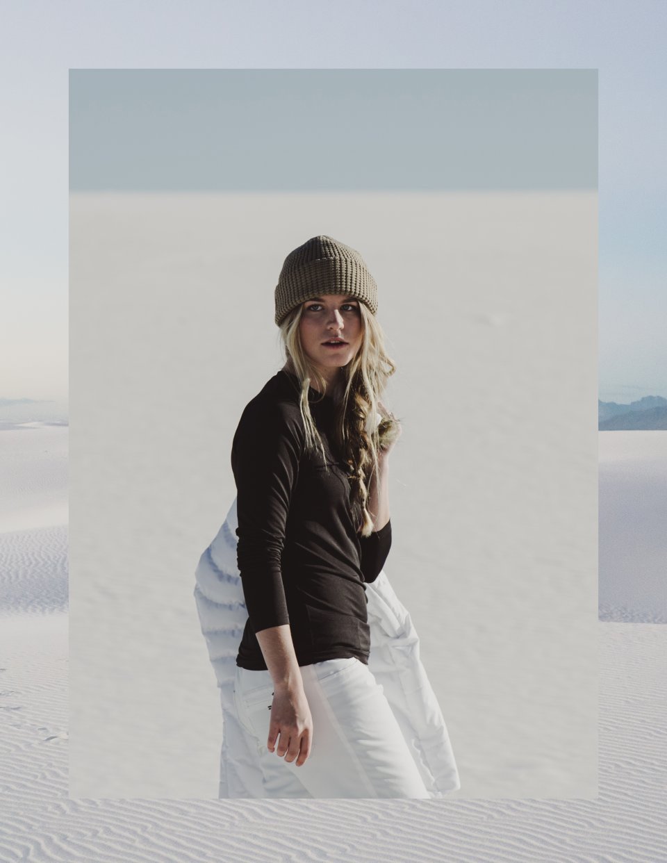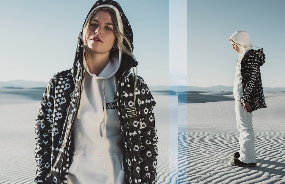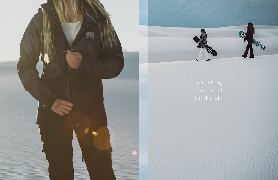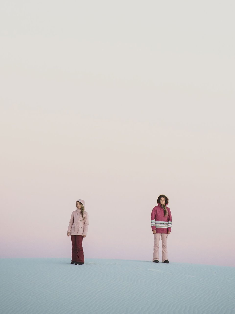 It’s pretty uncommon to see Maddie Mastro and Bekah Ashley off their snowboards. Even more uncommon is seeing them in fashion photography encircled by terrain that’s subtly snowless. That’s the direction we chose to take for the Billabong Women’s 2018 Snow Campaign. Shot in White Sands, New Mexico, the varying elements of the desert’s environment played well into each of the season’s apparel color-stories and inspired the names of each collection.