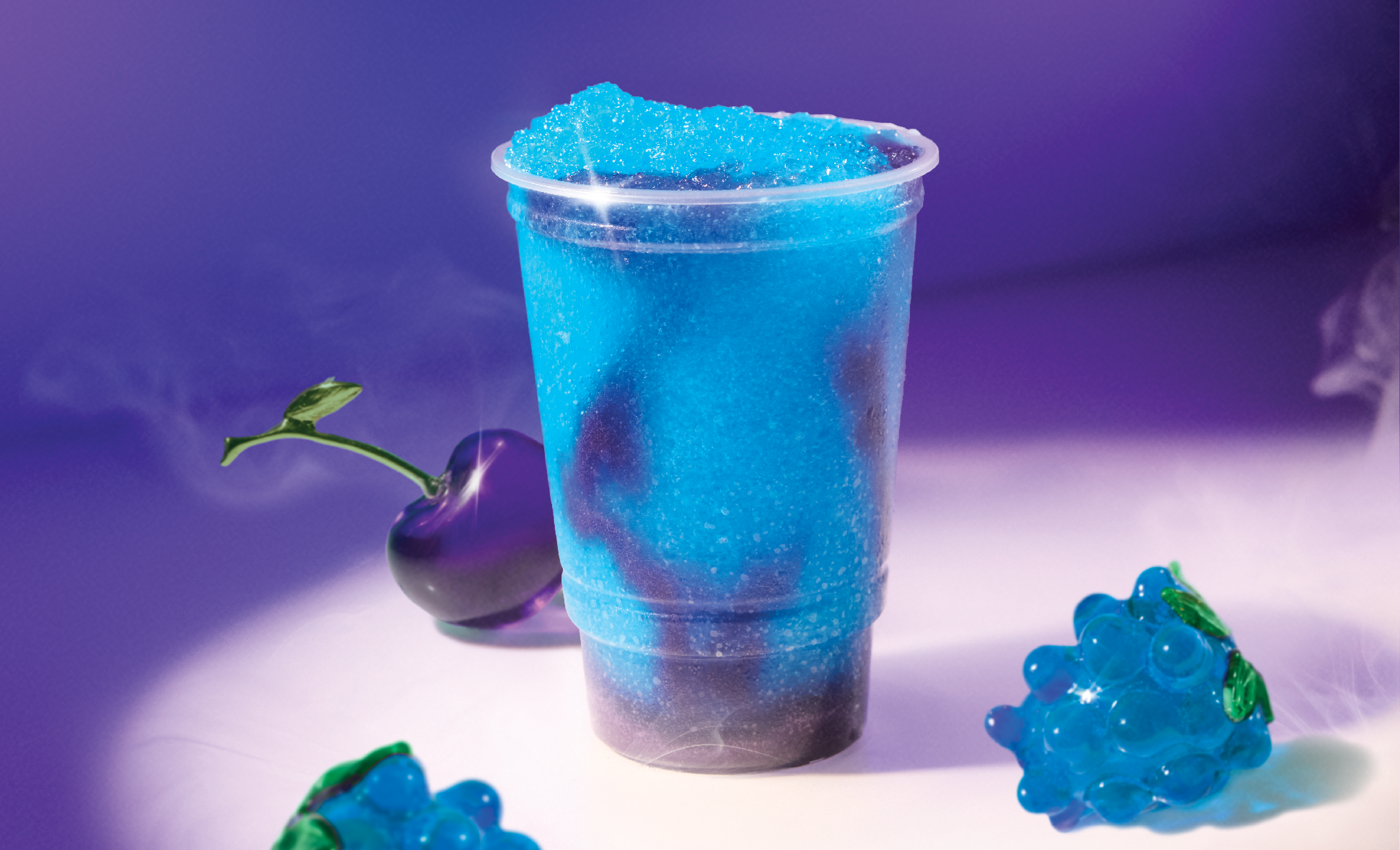 Taco Bell Freezes are meant to be fun, indulgent and unique, so I wanted to lean into the idea of “icy, refreshing, and treat” by showcasing the product in a playfully dreamy, cold environment surrounded by icy artifacts. Glass-blown fruit props and foggy dry ice condensation strengthened the frozen refreshment factor. Subtle twinkles, light refraction, and a shallow depth of field created a chilly atmosphere that alluded to the midnight name without screaming “Late Night.